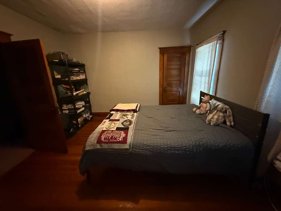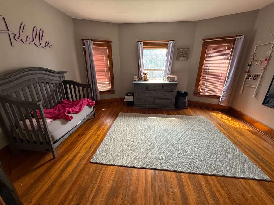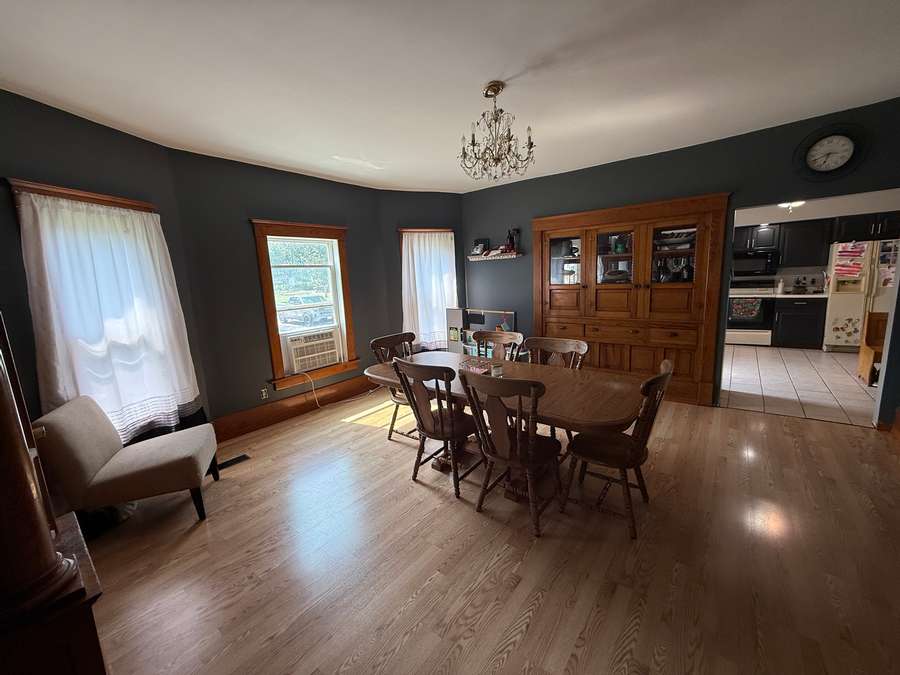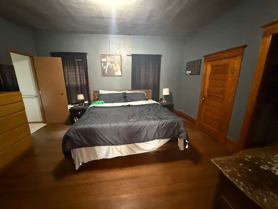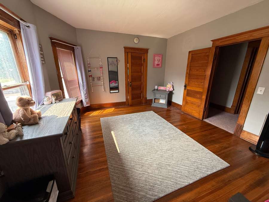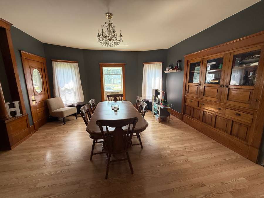 The main floor offers a remodeled kitchen with sleek black cabinetry and tile flooring that flows seamlessly into the updated bathroom. The spacious master bedroom is conveniently located on the main floor with direct access to the bathroom. Upstairs, you’ll find four additional bedrooms and a second bathroom featuring a clawfoot tub and new plank flooring. Original hardwood floors remain throughout much of the upstairs, adding warmth and character.