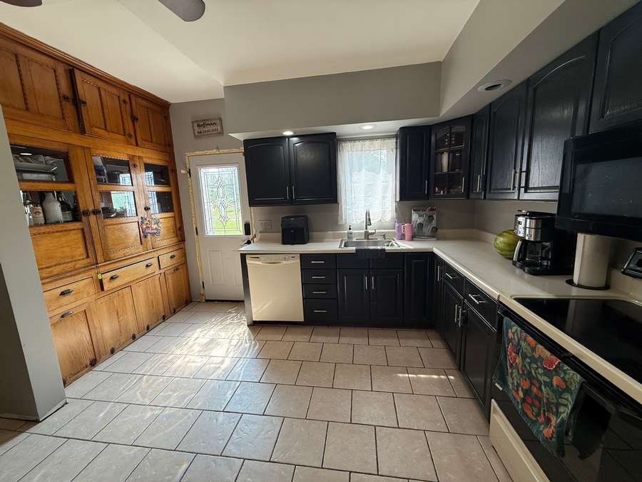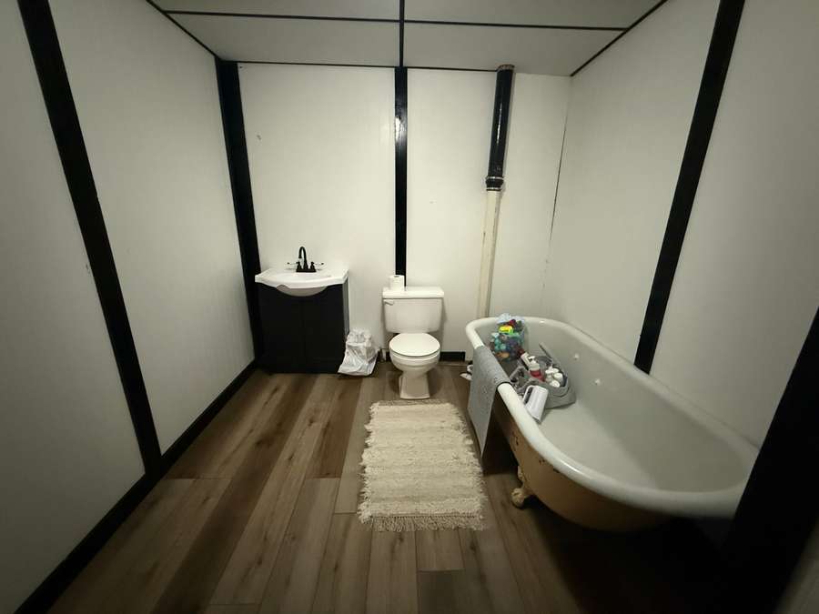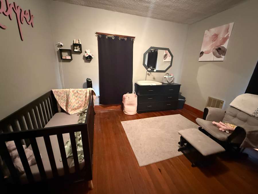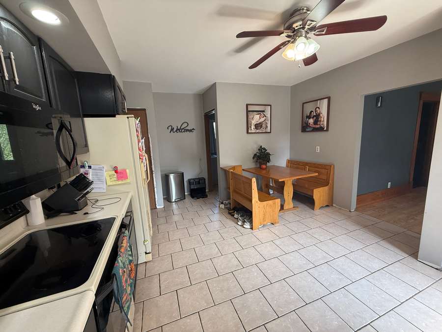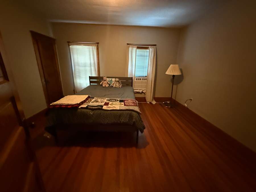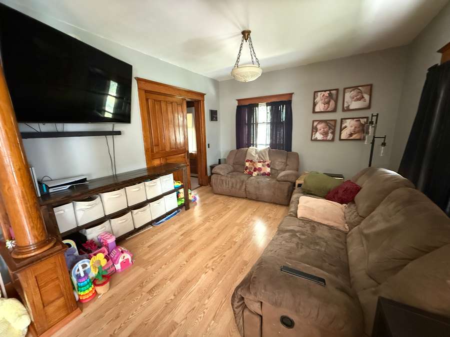 The main floor offers a remodeled kitchen with sleek black cabinetry and tile flooring that flows seamlessly into the updated bathroom. The spacious master bedroom is conveniently located on the main floor with direct access to the bathroom. Upstairs, you’ll find four additional bedrooms and a second bathroom featuring a clawfoot tub and new plank flooring. Original hardwood floors remain throughout much of the upstairs, adding warmth and character.