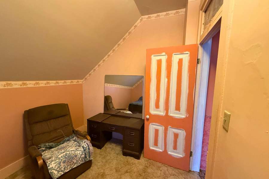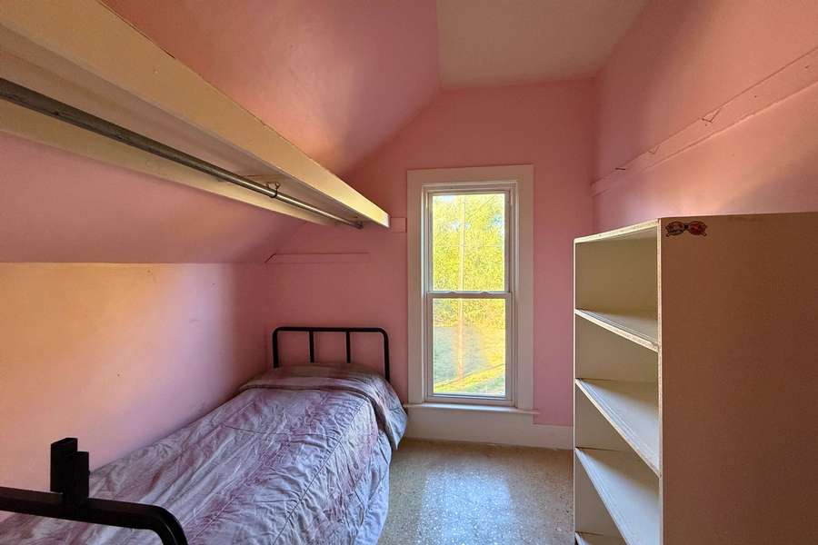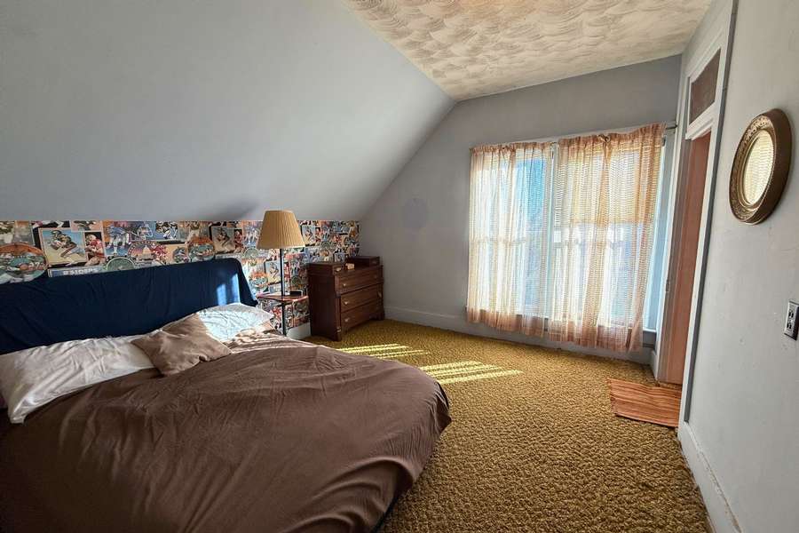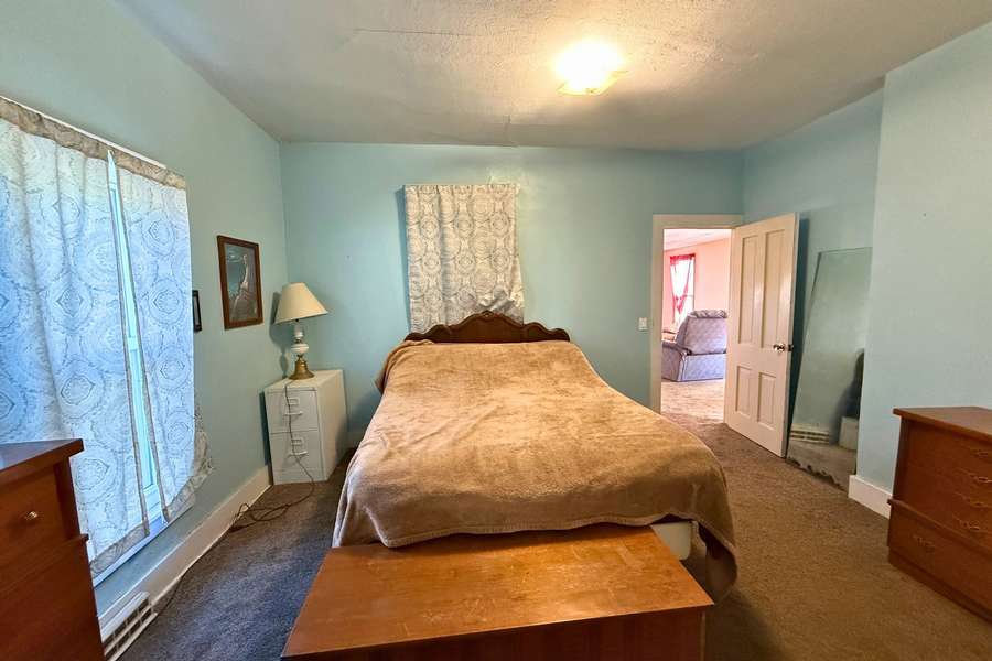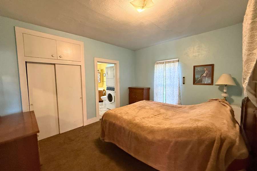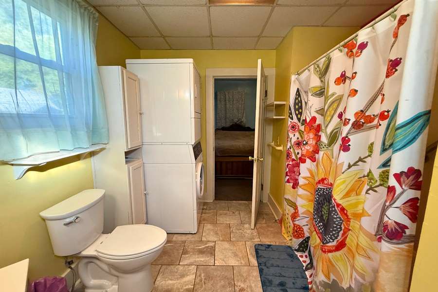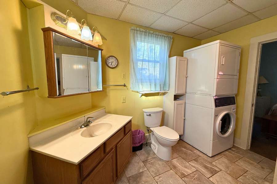 The spacious bathroom doubles as a laundry area, with a stackable washer and dryer included for convenience. Just off the bathroom, the primary bedroom is thoughtfully located on the main floor. Upstairs, you’ll find two additional bedrooms and two large separate closets, offering excellent storage.