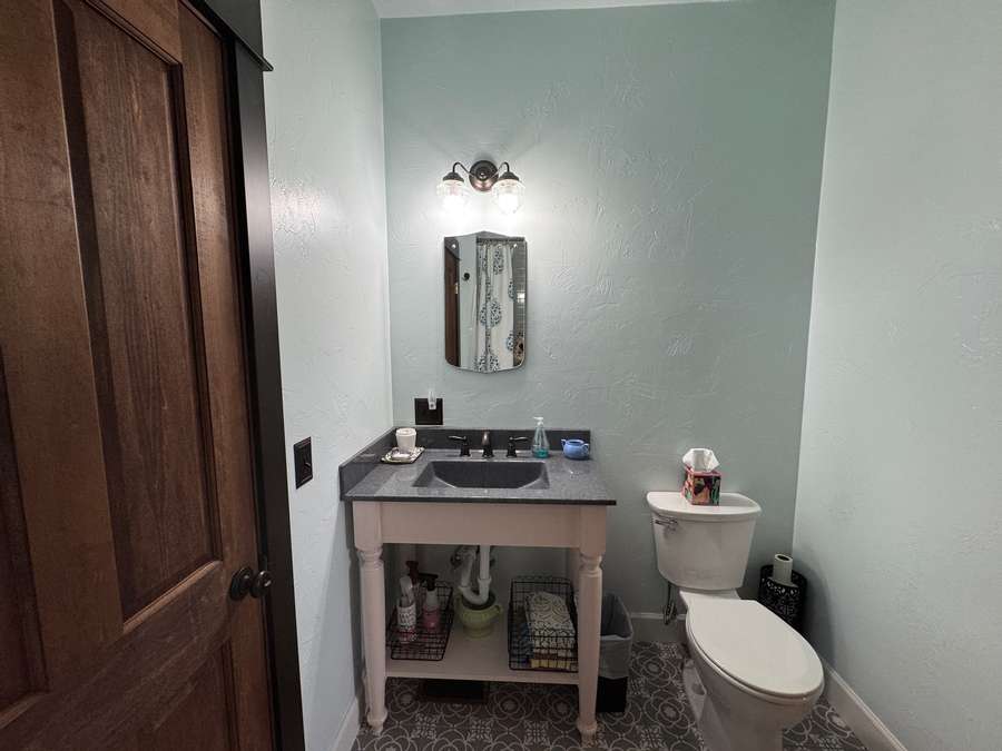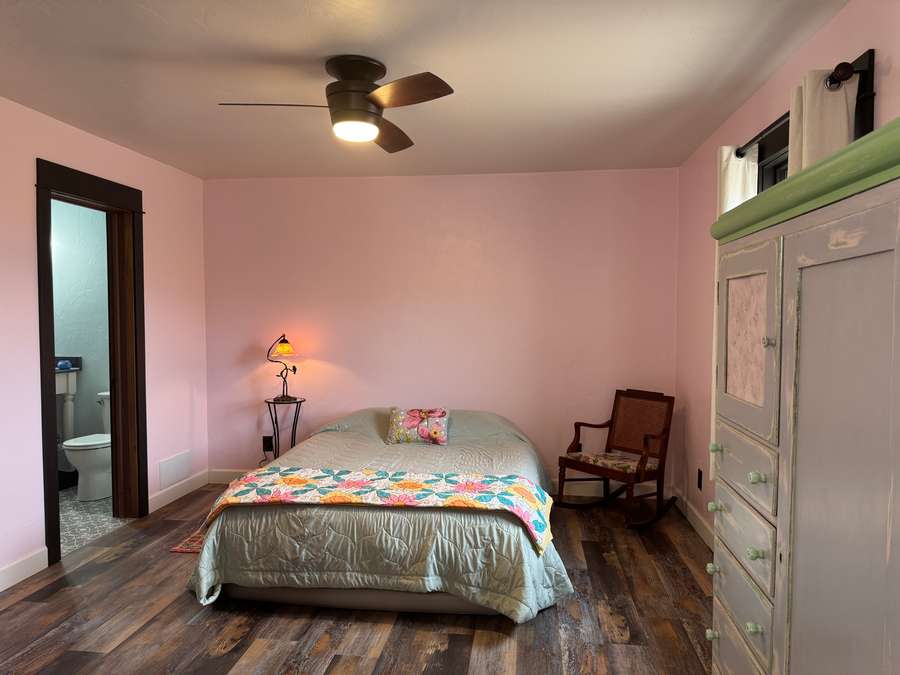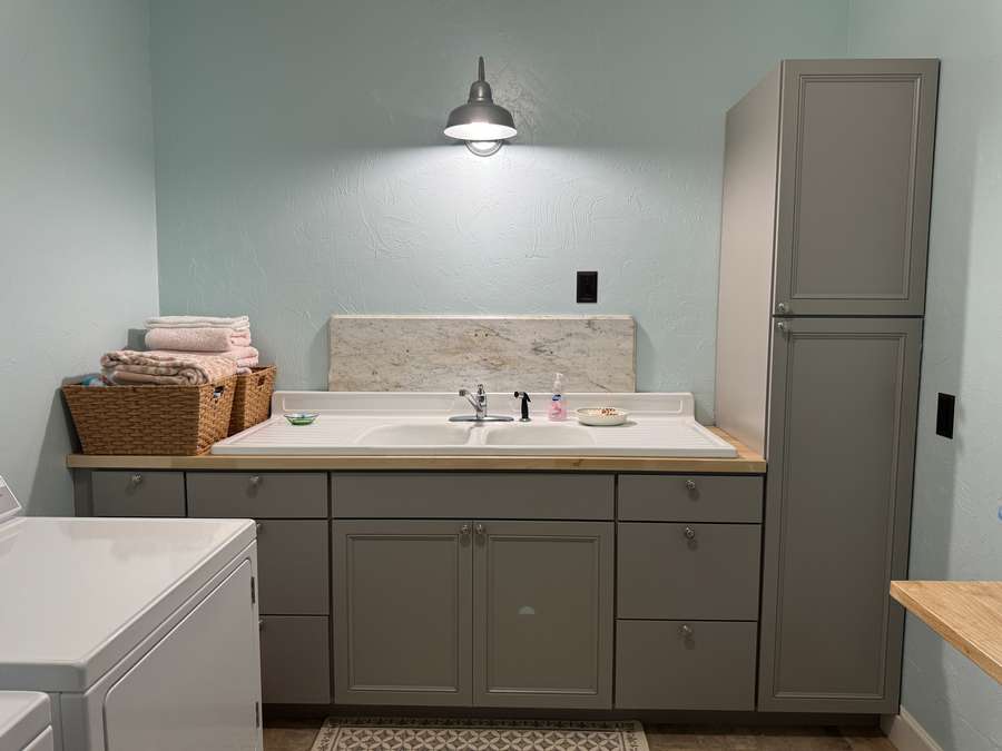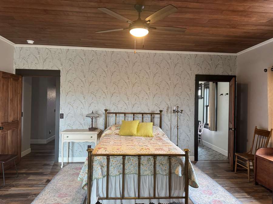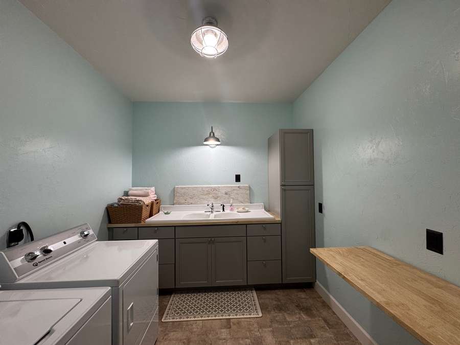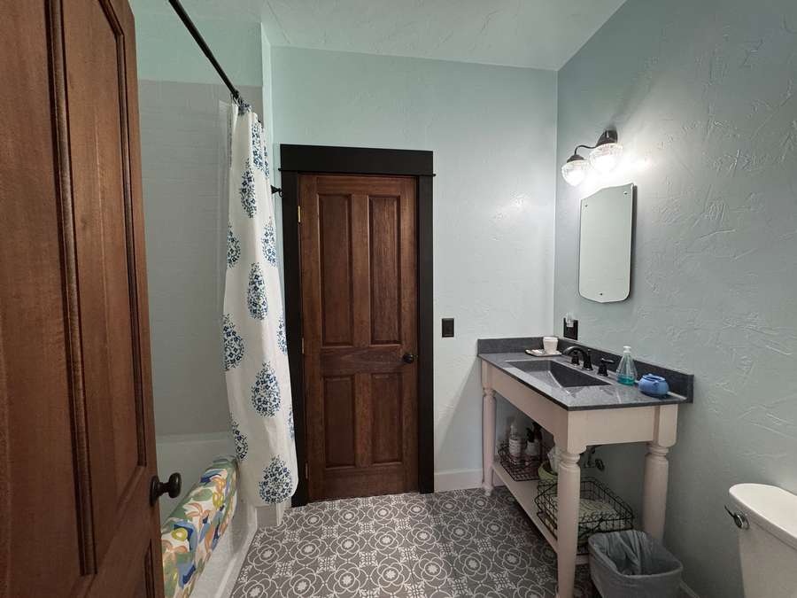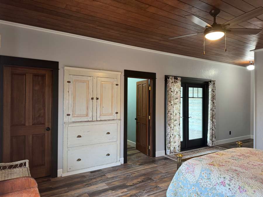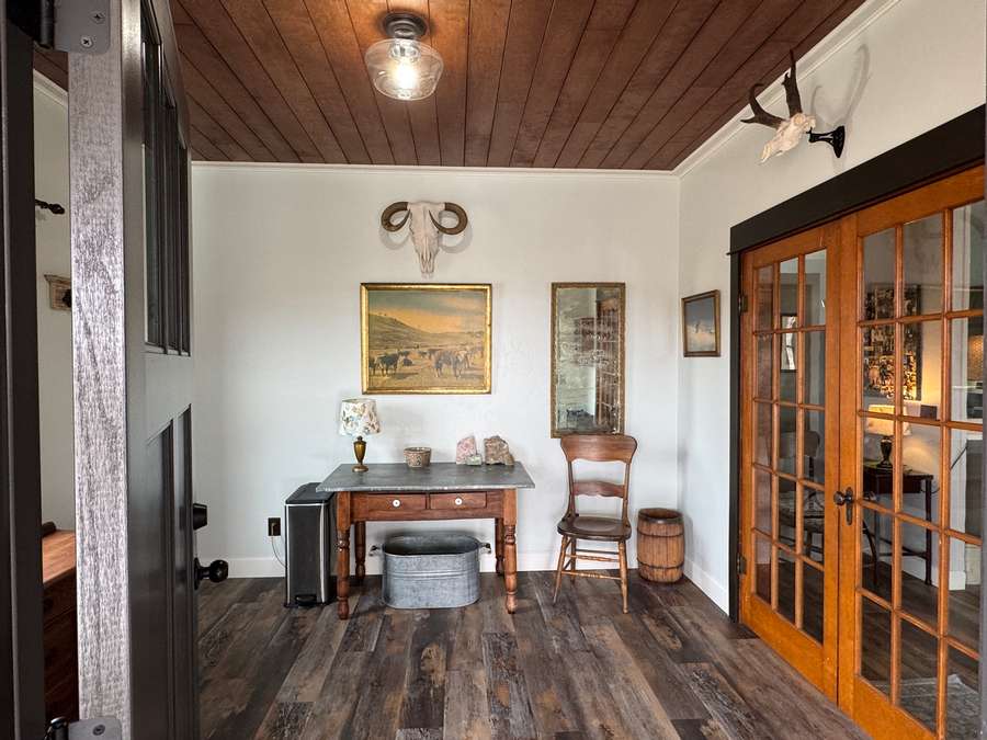 The home offers three bedrooms, including a spacious primary suite complete with two walk-in closets, antique built-in, and a private en suite bathroom. The bath features a custom-made double vanity, a separate toilet area, stand-alone shower, and a relaxing soaker tub. The second bedroom includes a cozy reading nook and direct access to the second bathroom, which is conveniently accessed from the hall. A possible third bedroom is currently utilized as an office, offering flexibility to suit your needs. The laundry room continues the home's unique character, featuring a reclaimed enameled steel sink/marble backsplash, complementing cabinetry, and a functional folding table. Step outside to enjoy the expansive wrap-around deck and covered porch—an ideal spot to unwind, take in the views, or add a hot tub for year-round relaxation.