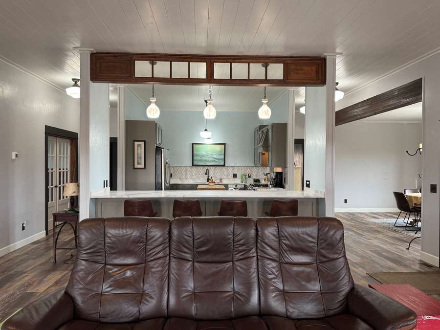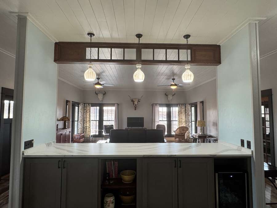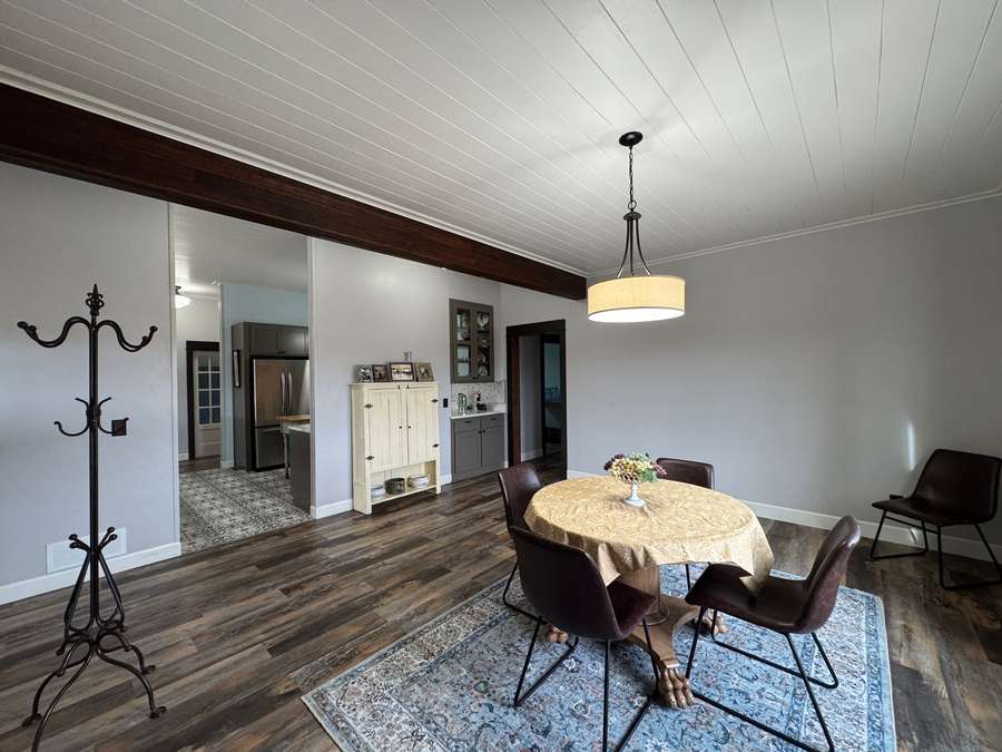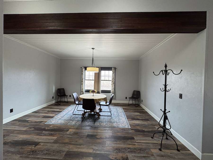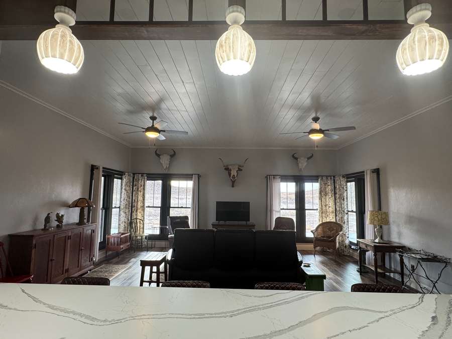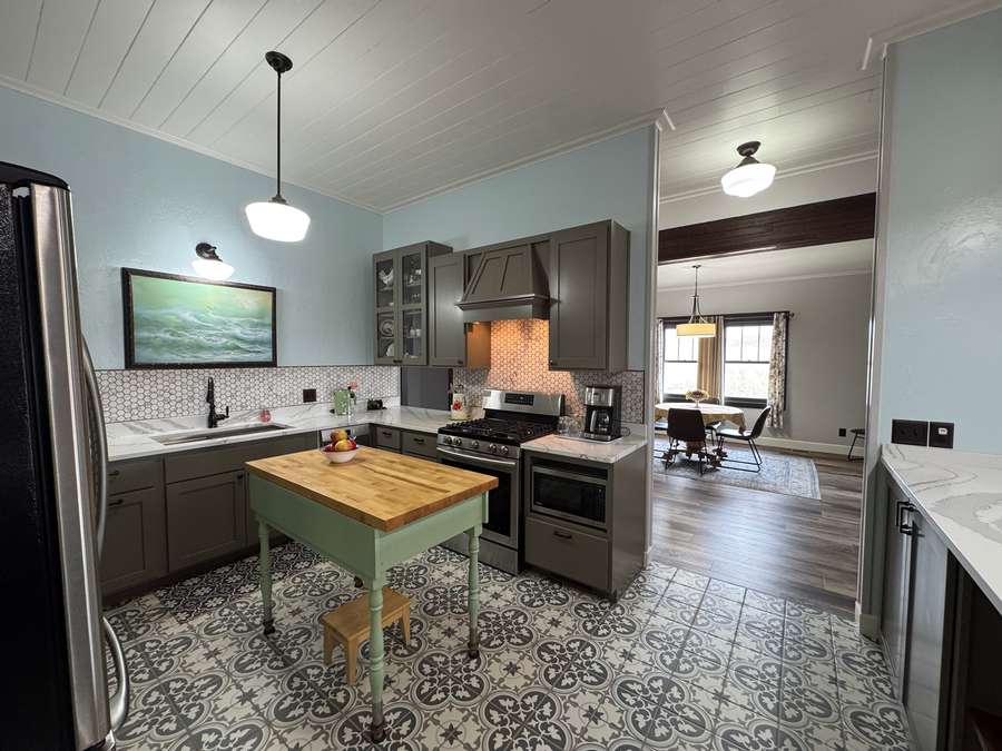 A welcoming entry sets the tone for the home, highlighting the thoughtful use of vintage repurposed items throughout. The kitchen is truly the heart of the home, featuring custom cabinetry, stainless steel appliances, and quartz countertops. A large island with transom and pendant lighting add vintage flair while opening seamlessly to the living area. Abundant natural light and sweeping Sandhills views make this one of the most enjoyable spaces in the home. The separate dining area features a convenient pass-through window from the kitchen, making it ideal for sit-down meals or entertaining guests. A pantry is nearby to store kitchen overflow.