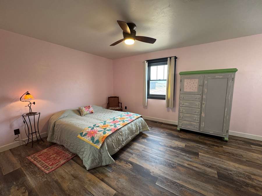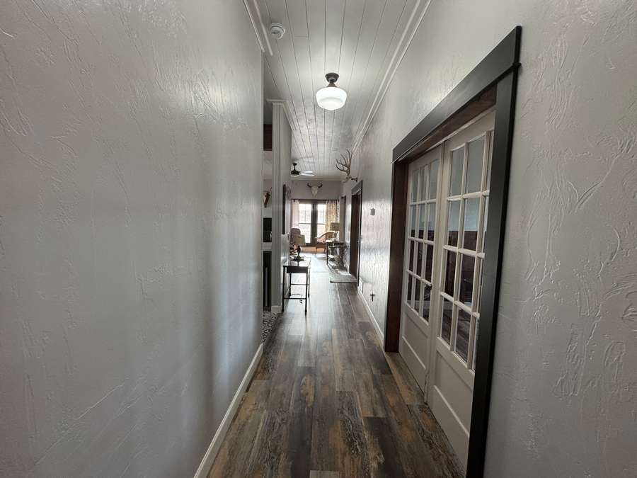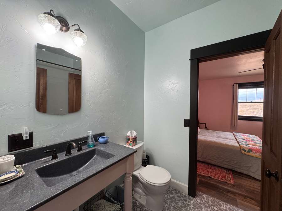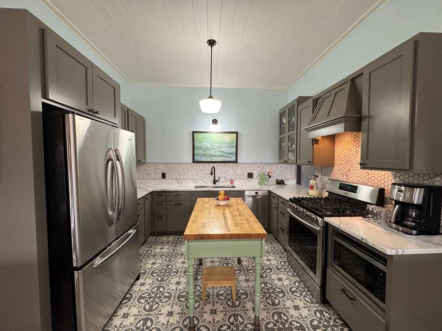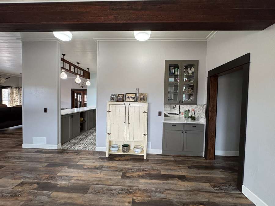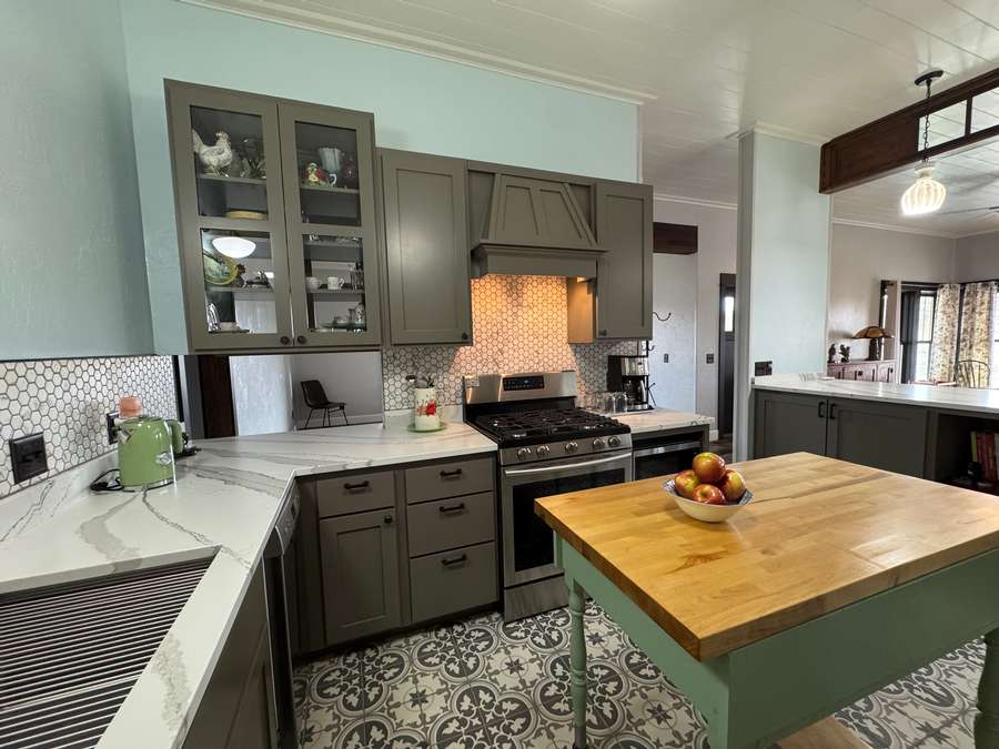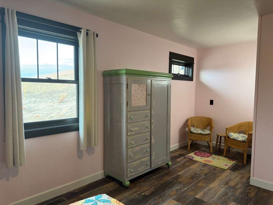 A welcoming entry sets the tone for the home, highlighting the thoughtful use of vintage repurposed items throughout. The kitchen is truly the heart of the home, featuring custom cabinetry, stainless steel appliances, and quartz countertops. A large island with transom and pendant lighting add vintage flair while opening seamlessly to the living area. Abundant natural light and sweeping Sandhills views make this one of the most enjoyable spaces in the home. The separate dining area features a convenient pass-through window from the kitchen, making it ideal for sit-down meals or entertaining guests. A pantry is nearby to store kitchen overflow.