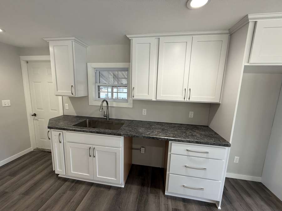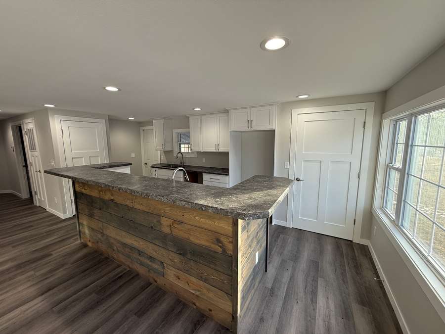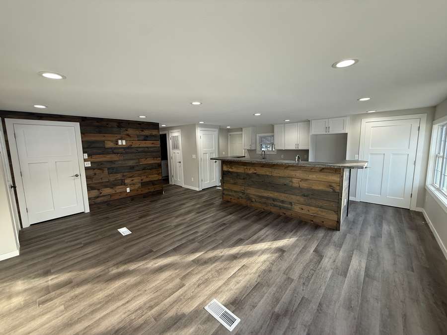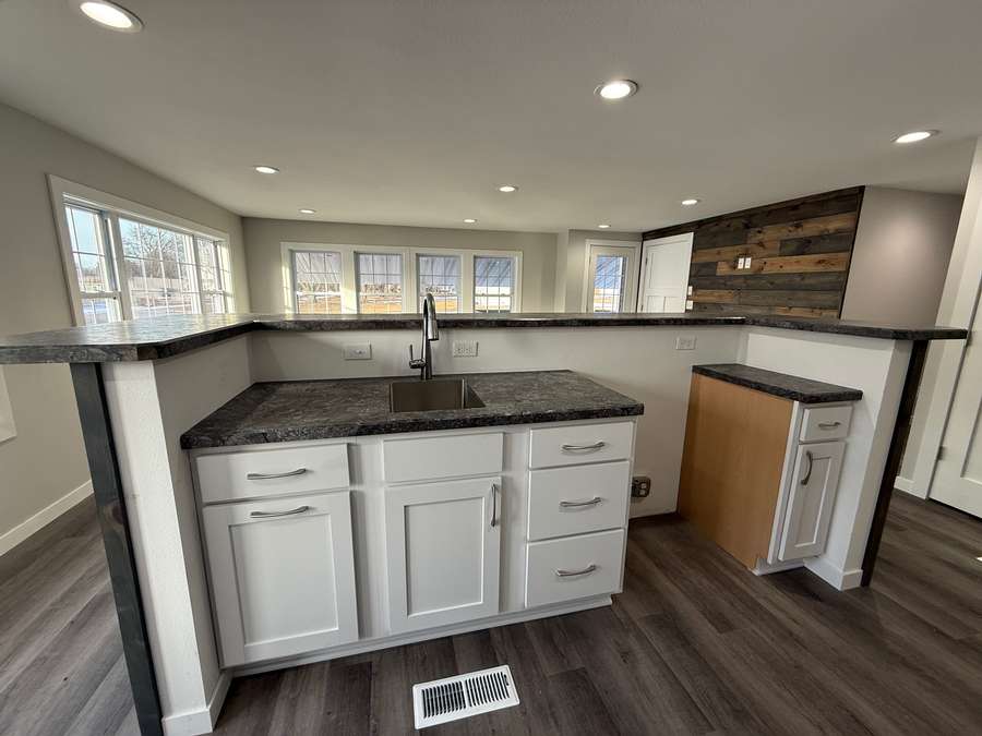 The kitchen features white cabinetry, two sinks (including one in the wet bar), and a unique accent wall and bar front finished with repurposed wood planks — adding a warm, rustic touch that perfectly complements the clean, modern updates.