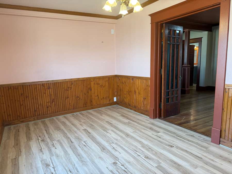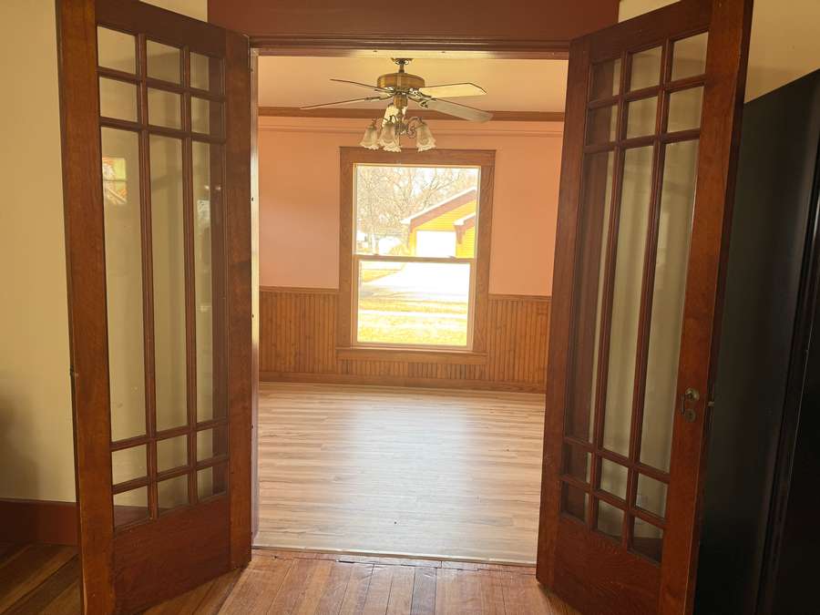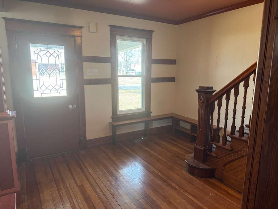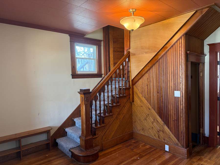 From the moment you enter, you’re welcomed by a warm and inviting foyer showcasing an antique staircase — complete with detailed wood spindles and newel post with carved accents. The craftsmanship throughout the home is exceptional, with original hardwood floors, rich woodwork, multi-panel solid wood doors, antique hardware, crown molding, and wide baseboards that create a sense of timeless elegance.