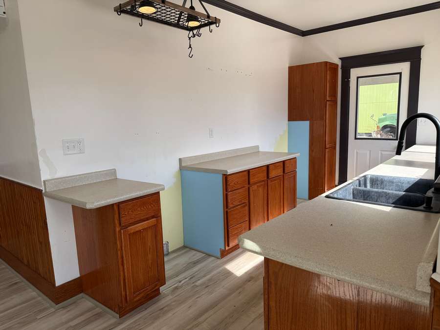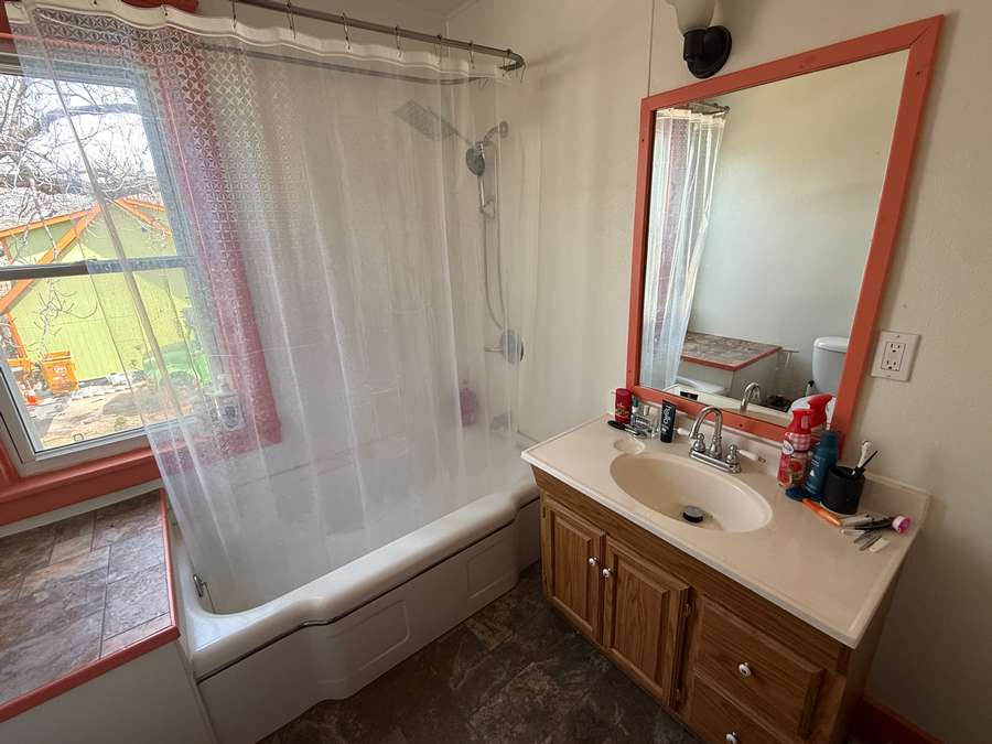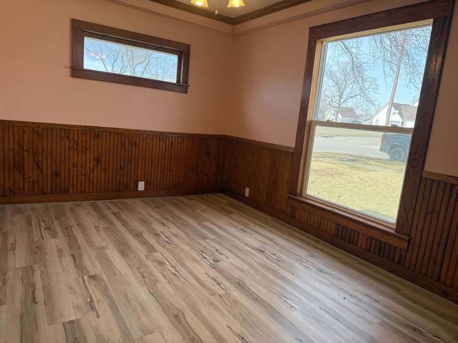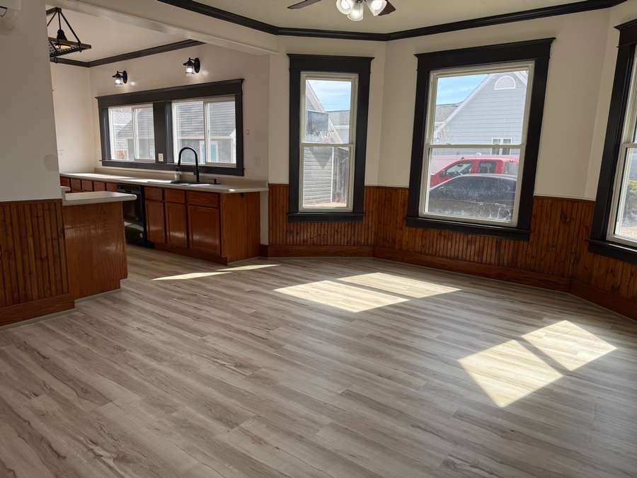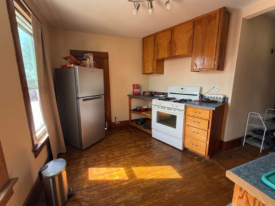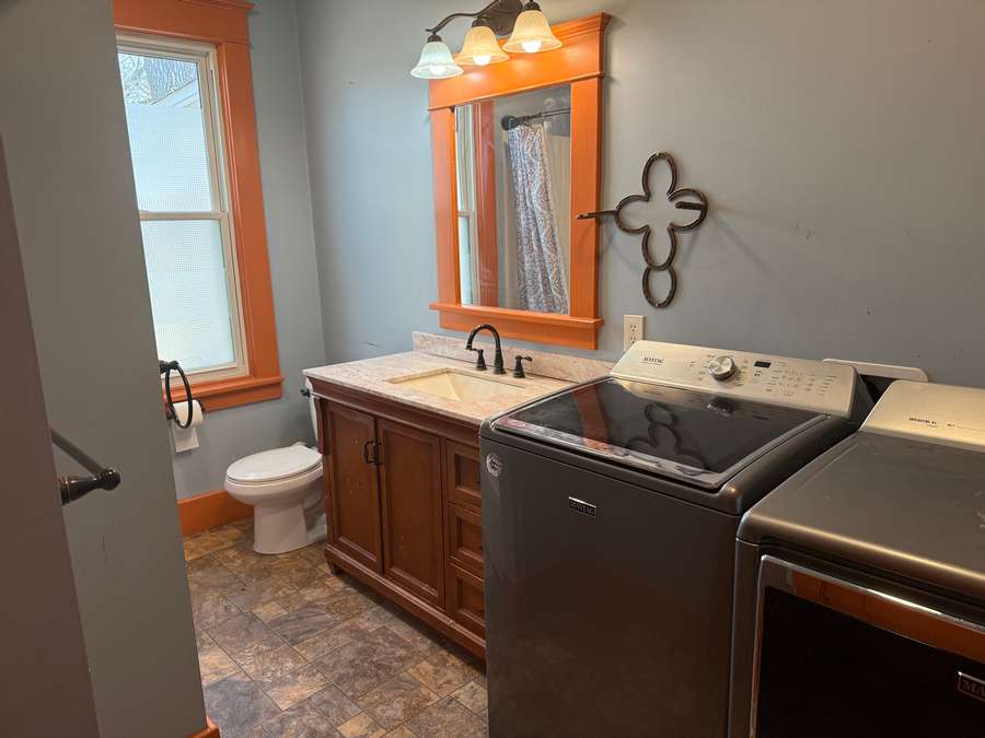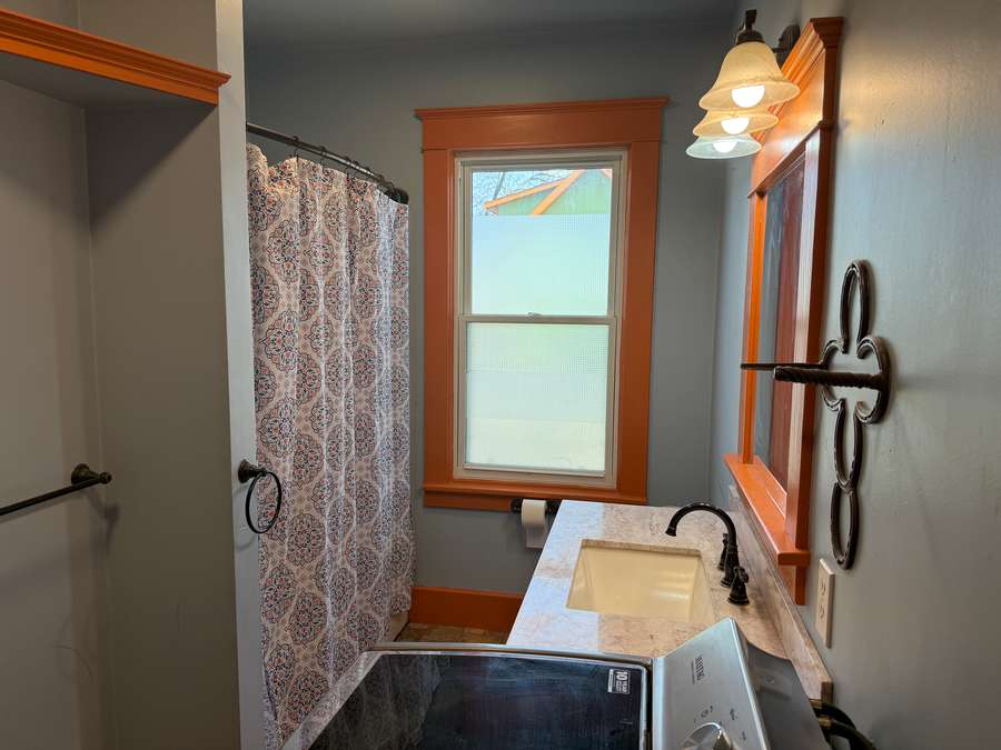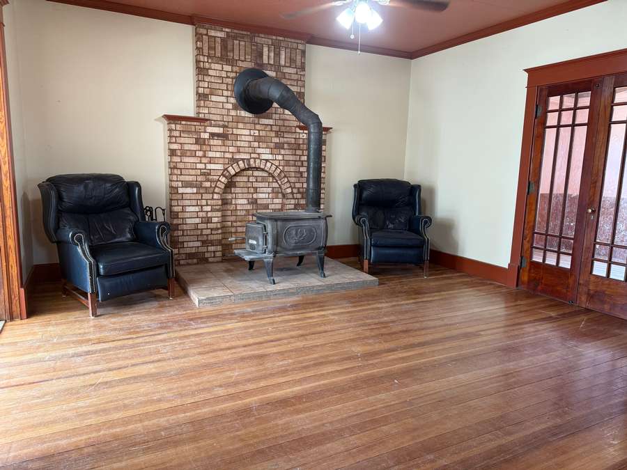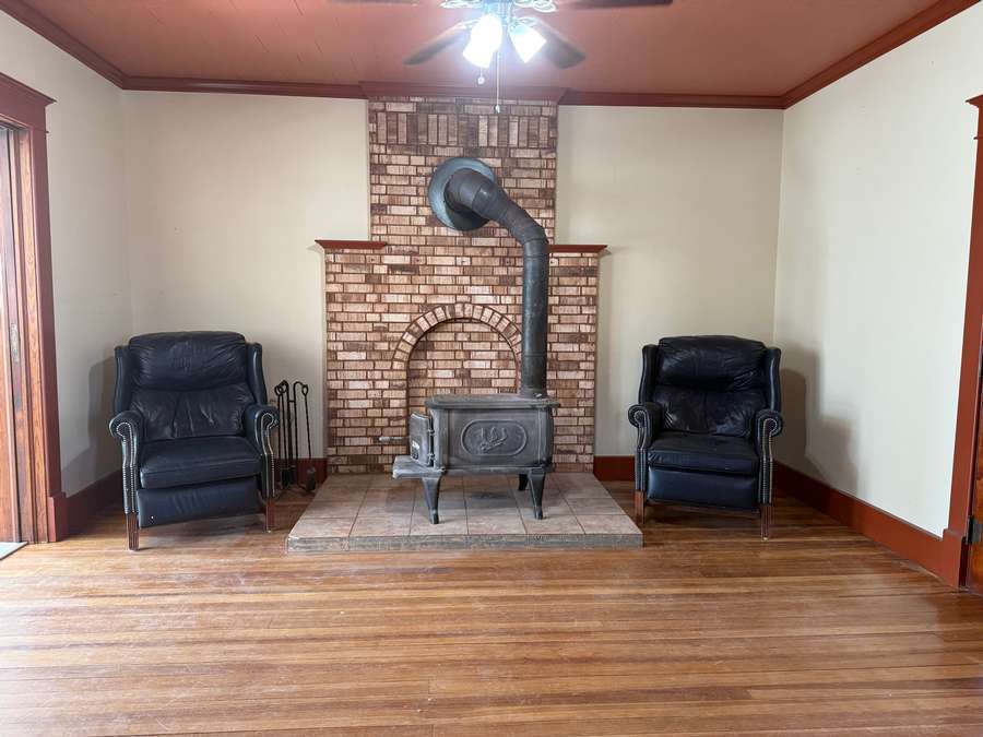 The main floor offers a functional layout, including a spacious living room with cozy wood stove and unique fireplace backdrop. Just off the living area, there is a den with antique French glass doors provides the perfect space for an office or sitting room. The large dining room features a bright, window-lined nook and flows seamlessly into the updated kitchen, complete with refreshed cabinetry, countertops, lighting, and a hanging pot rack that adds a touch of classic charm. A full bathroom/laundry room combo complete the main level.