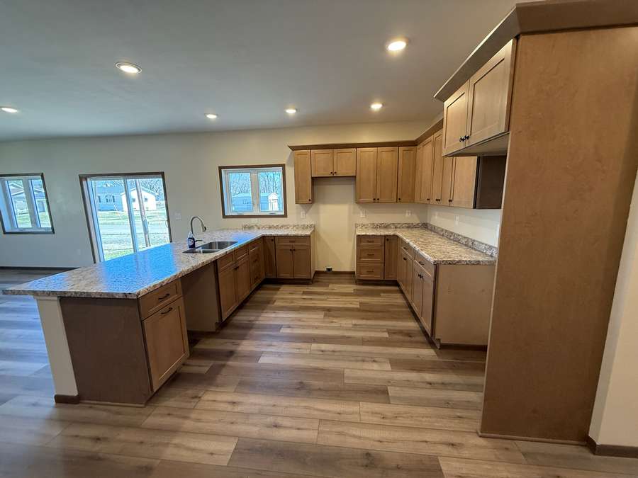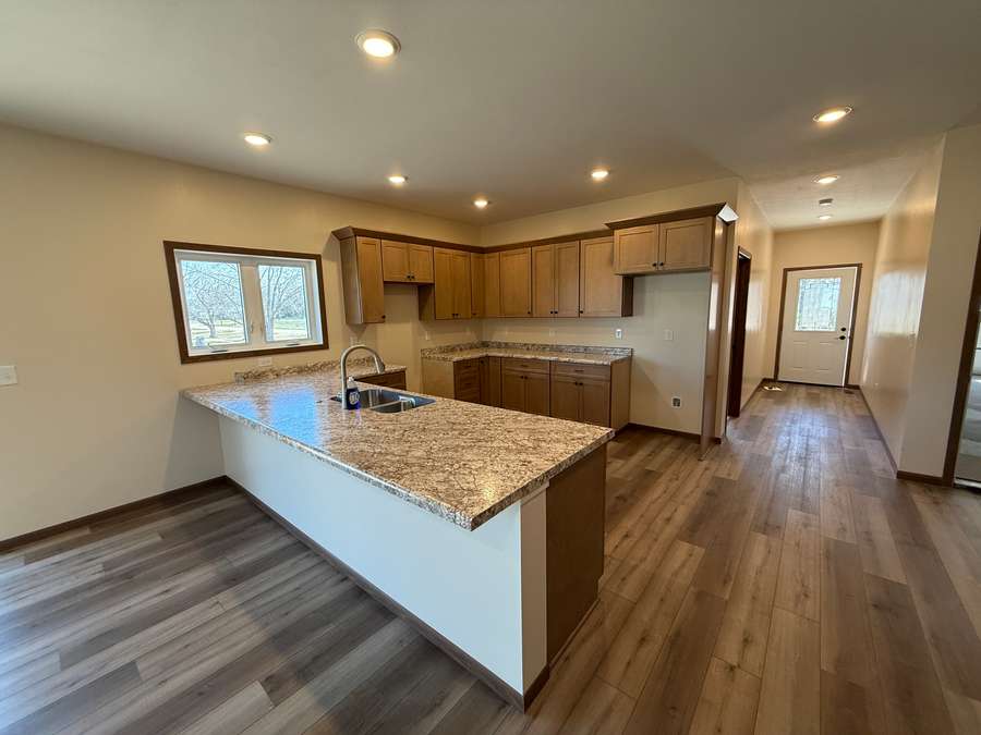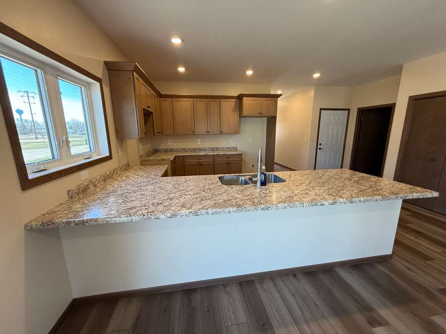 Step inside to an inviting open-concept floor plan featuring a spacious kitchen, dining, and living area designed for comfortable everyday living and easy entertaining. The kitchen offers abundant cabinetry, modern countertops, and a large sit-up peninsula island with sink overlooking the dining and living room so you can stay connected while preparing meals or hosting guests. Glass patio doors off the living area provide excellent natural light and convenient outdoor access.