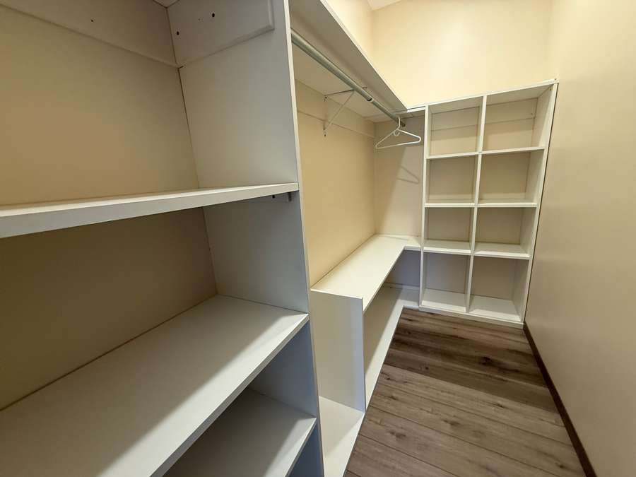 Just off the front entry, you’ll find a bedroom with closet that would also make an ideal office, nursery, or guest room. Down the hall from the main living area are two additional bedrooms, including a spacious primary suite complete with its own private bathroom featuring a walk-in shower with built-in seat and a walk-in closet with shelving. A second full bathroom with tub/shower combo and conveniently located laundry room sit between the bedrooms for added practicality and convenience.