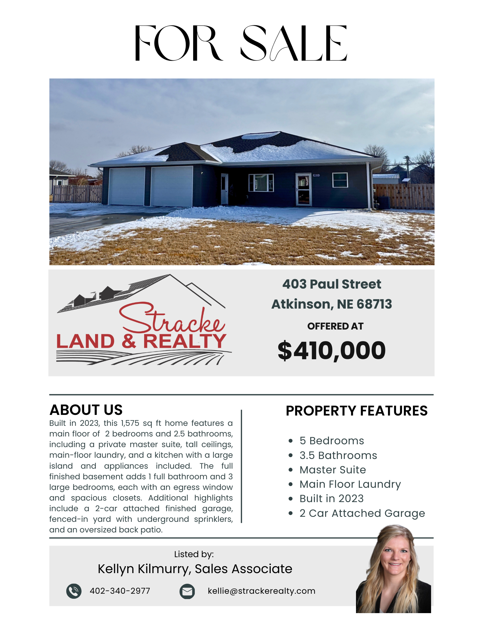 Built in 2023, this modern and spacious home offers 1,575 square feet of thoughtfully designed main-level living with a total of 5 bedrooms and 3.5 bathrooms. The main floor features two bedrooms and two-and-a-half bathrooms, including a private master suite, tall ceilings, large closets, and convenient main-floor laundry. The kitchen is designed for both function and entertaining, featuring a large island and appliances included.
