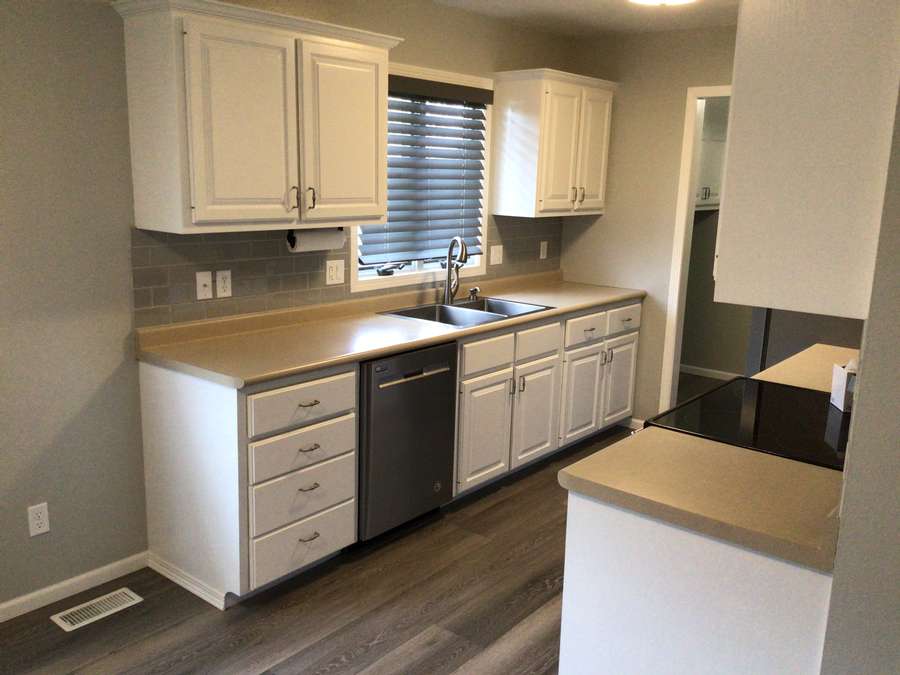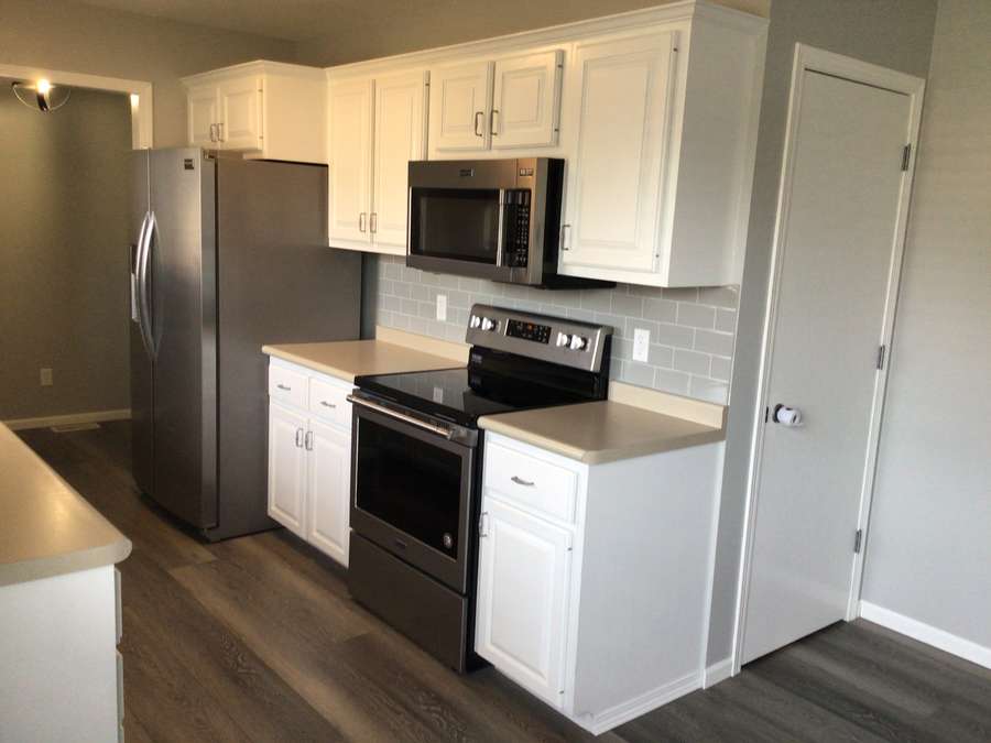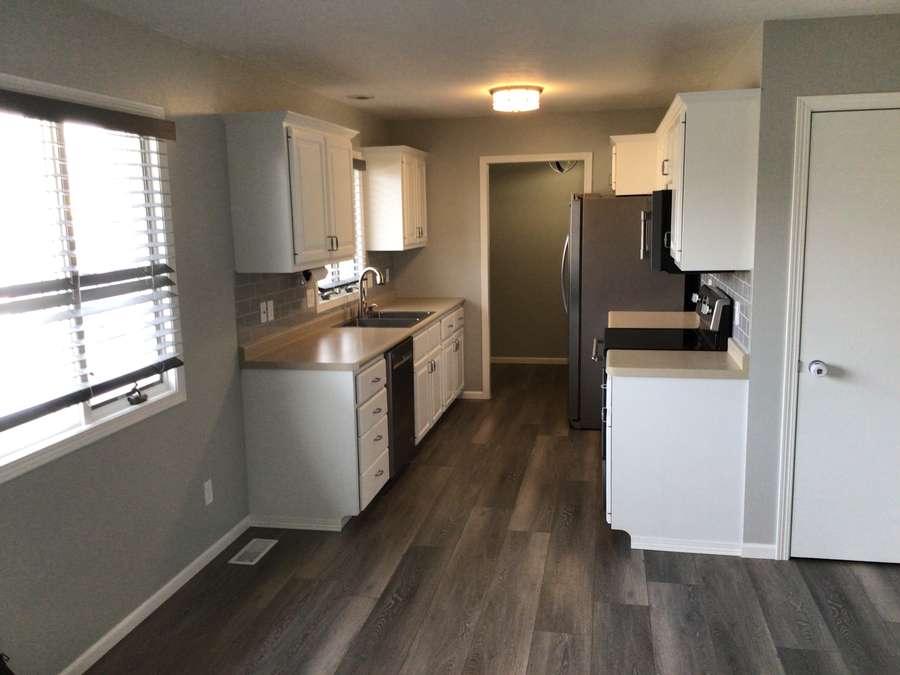 Step inside to a welcoming living room featuring updated flooring that flows throughout the main level. The open dining area connects seamlessly to the kitchen, complete with bright white cabinetry, stainless steel appliances, and abundant counter space. Just off the kitchen, the laundry room offers additional cabinetry for convenient storage. The main floor includes two comfortable bedrooms, a full bathroom, and a spacious primary suite with dual closets and a private bathroom.